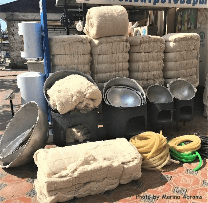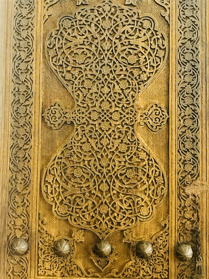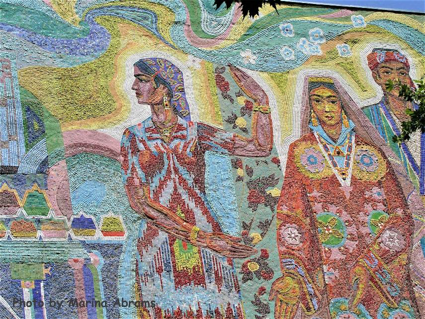 Black, white, and red – traditional colors for embroidery in Samarkand, Uzbekistan.These ancient embroidery designs symbolize the sun, stars, and moon.For centuries, people believed that celestial bodies in embroidery would protect them from evil spirits.The pomegranate is a symbol of fertility and prosperity.The intricate needlework creates dancing lines that enchant the viewer and take you to a different world.Embroidered pieces were part of a bride’s dowry, meant to protect her and her family from evil and illness.Mosaic, Dushanbe, TajikistanMosaic, Almaty, KazakhstanStoves and cauldrons, hoses, and bundled cotton for mattresses. Samarkand, Uzbekistan.Central Asian bread – non or nan – a symbol of the sun! Margilan, UzbekistanFragment of a 19th century wooden door from Khiva. The State Museum of Art, Tashkent, Uzbekistan.Chor Minor, built 1807, Bukhara. My favorite building in Uzbekistan.